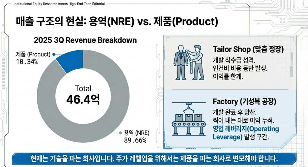 - NRE 매출은 견조하게 유지되나, 제품(양산) 전환은 더딤 (비중 10%대 유지).