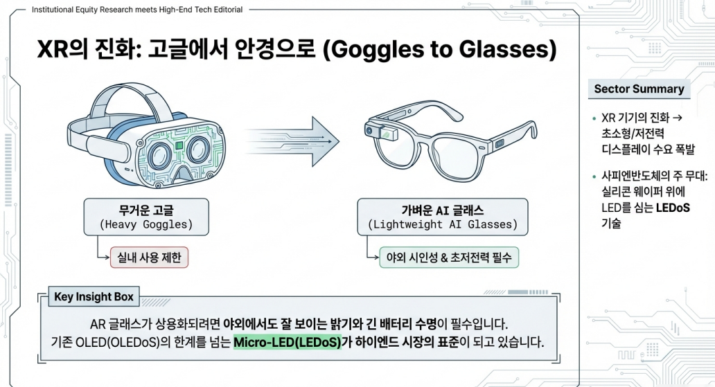 - XR(확장현실) 기기가 '무거운 고글'에서 '가벼운 AI 글래스'로 진화하며 초소형/저전력 디스플레이 수요가 폭발 중입니다.