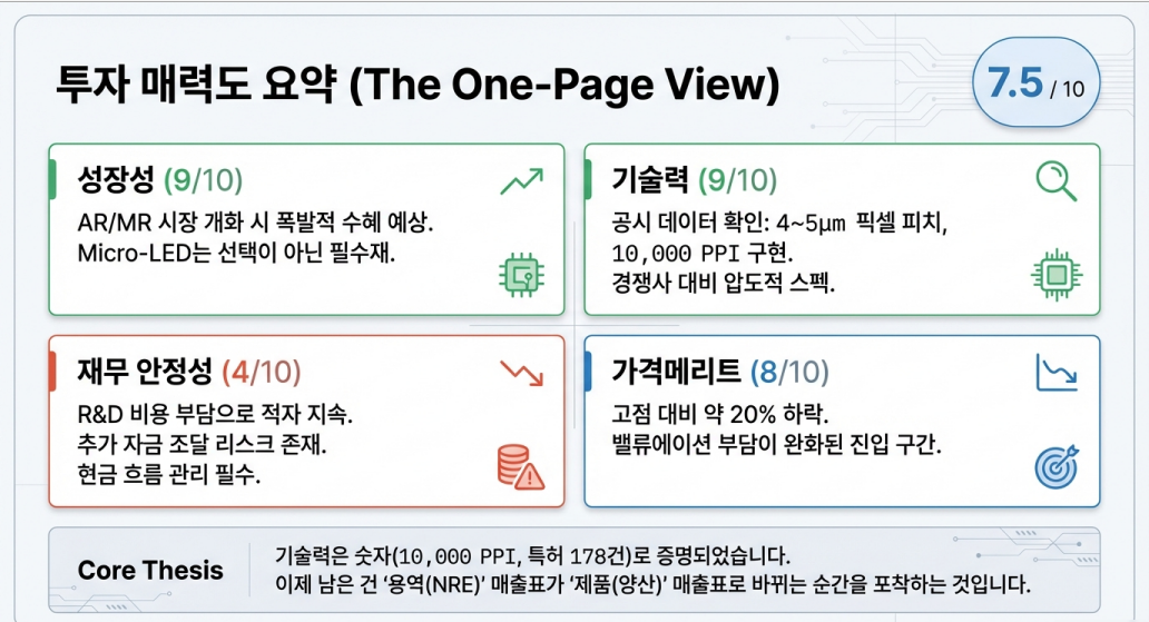 - 성장성 (9/10): AR/MR 시장 개화 시 폭발적 수혜 (Micro LED 필수재).