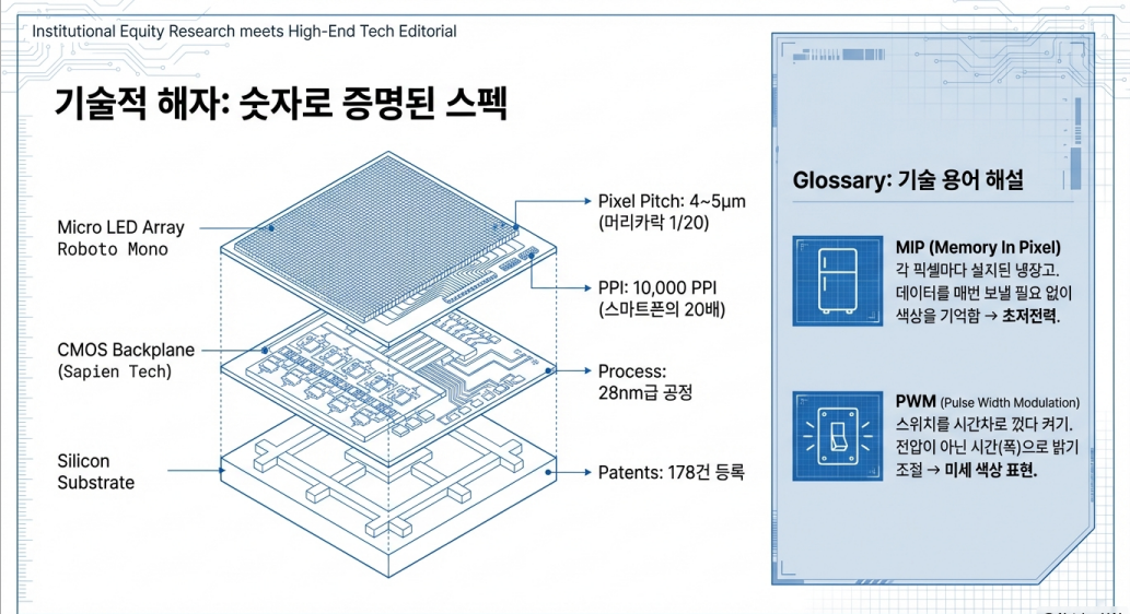- 초저전력 MIP 기술: 배터리 수명이 핵심인 AR 글래스에서 사피엔의 MIP(Memory In Pixel) 기술은 선택이 아닌 필수입니다. 전력 소모를 줄여야 안경을 오래 쓰고, 발열을 줄일 수 있기 때문입니다.