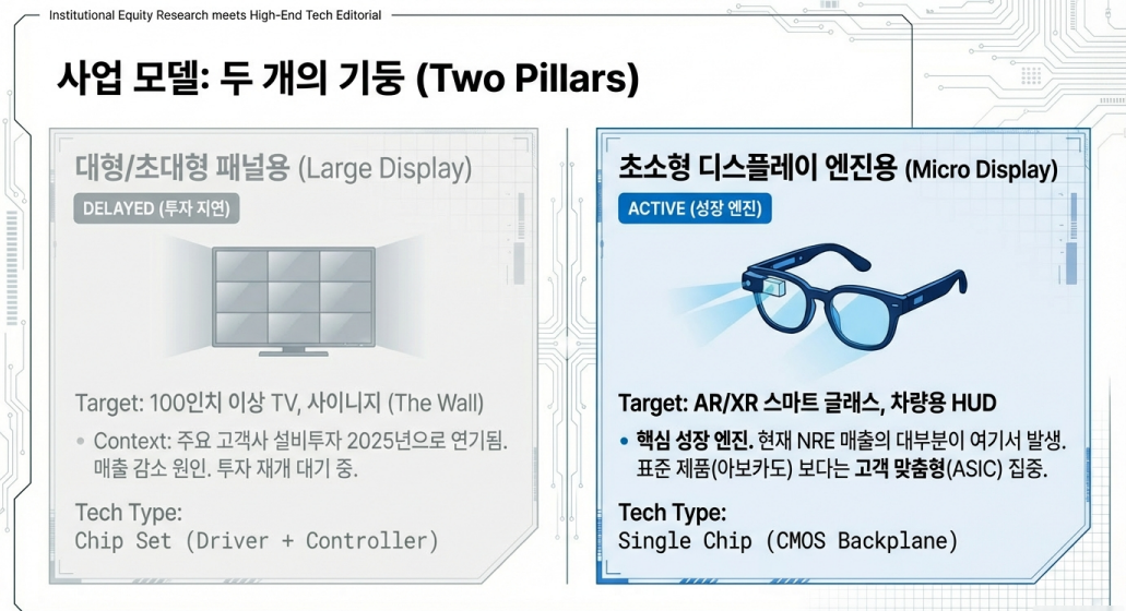 사피엔반도체는 디스플레이 구동 시스템반도체(DDIC)를 설계하는 팹리스입니다. 사업 모델은 크게 **'대형'**과 '초소형' 두 축으로 명확히 나뉩니다.