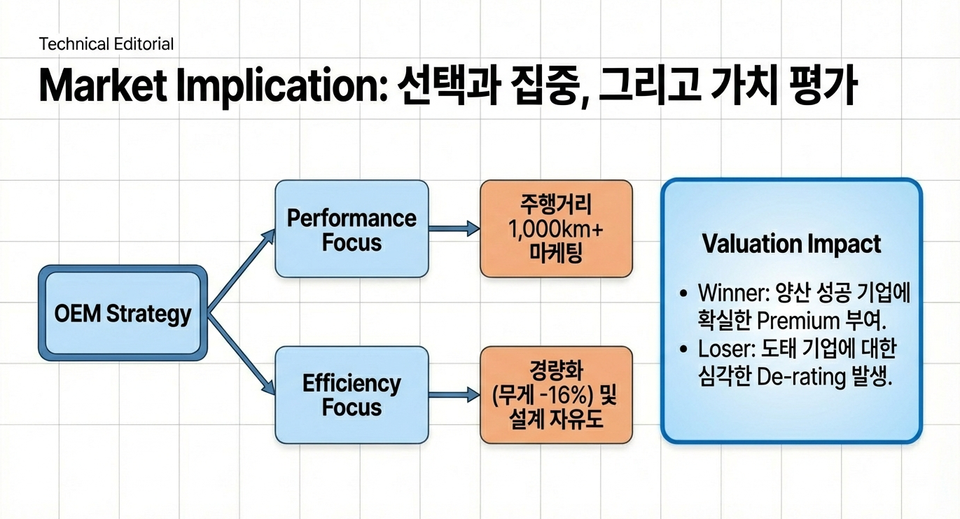 - 완성차 OEM에 미치는 영향: 전략적 선택의 기회 전고체 전지가 제공하는 높은 에너지 밀도와 안전성은 완성차 OEM에게 두 가지 매력적인 전략적 선택지를 제공합니다.
