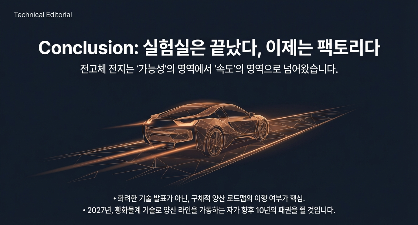 - 주장: 전고체 전지, 특히 기술적 우위와 양산성이 검증된 황화물계 기술을 선점하는 기업이 미래 프리미엄 EV 배터리 시장의 지배자가 될 것입니다.