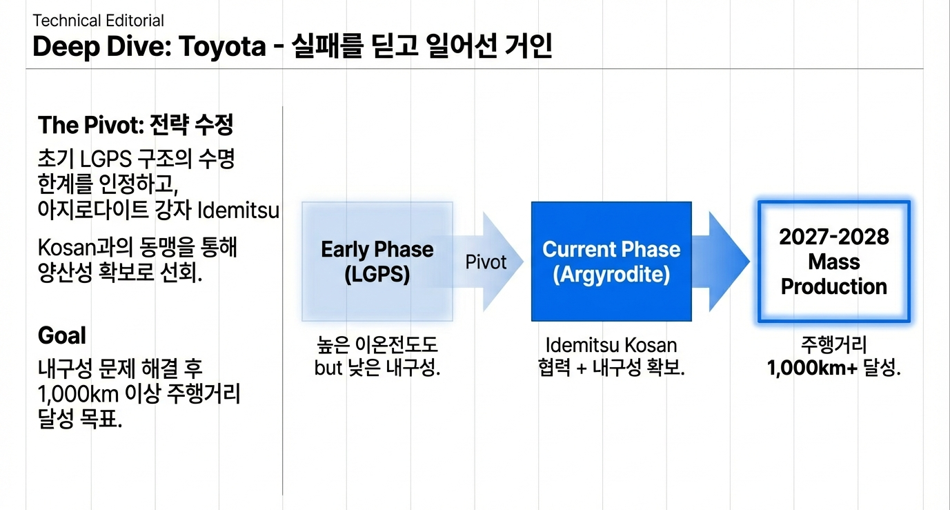 | Toyota | 황화물계 (LGPS) | 2027~2028년 | 1,000km+ 주행거리 | 내구성 문제 해결 과제, Idemitsu Kosan과 협력 |