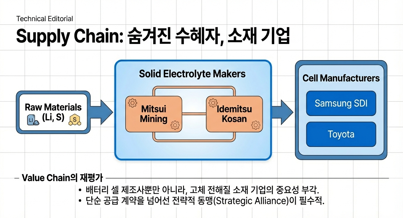 - 근거: 일본의 Mitsui Mining & Smelting은 최근 고체 전해질 양산 테스트 설비의 2차 증설을 결정하며 생산 능력을 3배로 확대할 계획이며, Idemitsu Kosan 역시 Toyota와의 협력을 통해 대규모 생산을 준비 중입니다. 이는 전방 산업의 양산 수요가 실재함을 명확히 보여주는 증거입니다.