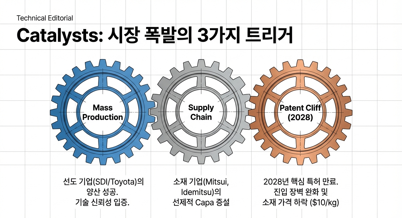 현재까지의 데이터는 황화물계, 특히 안정성과 양산성을 겸비한 아지로다이트 구조가 상용화의 열쇠를 쥐고 있음을 명확히 시사합니다. 이러한 시장의 개화는 몇 가지 핵심적인 촉매제에 의해 더욱 가속화될 전망입니다.