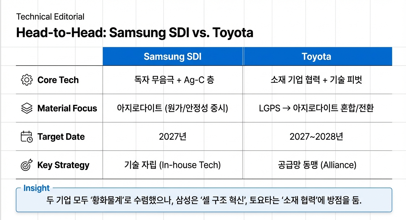 양산 경쟁을 주도하는 두 기업은 동일한 황화물계 기술을 추구하면서도, 세부적인 접근 방식에서 뚜렷한 차이를 보입니다.