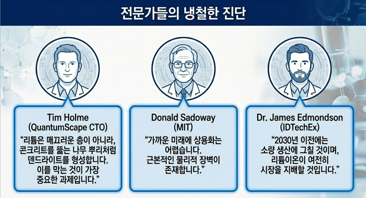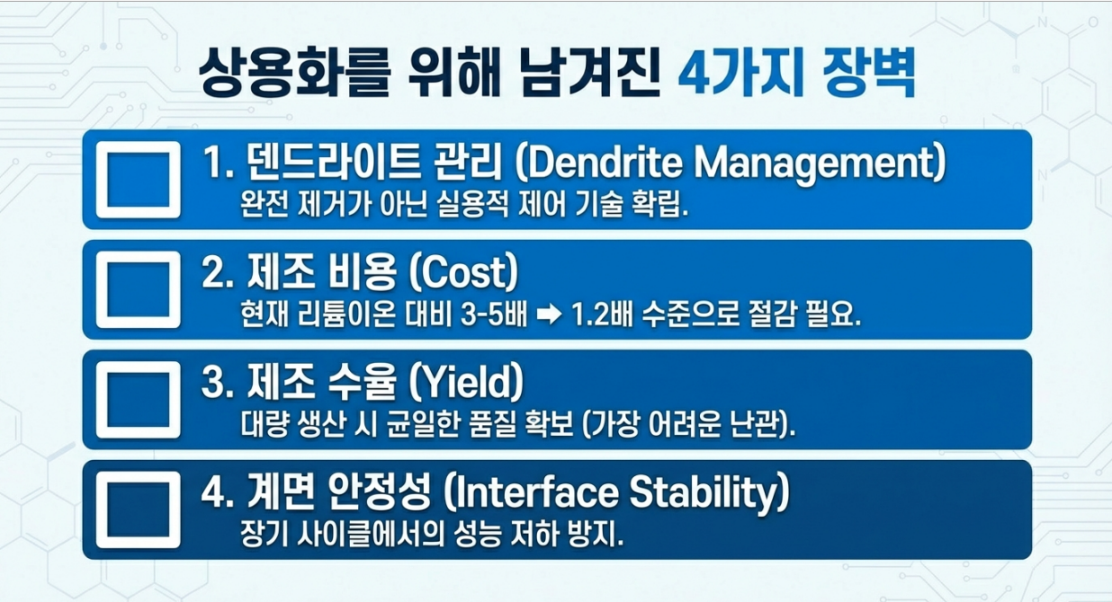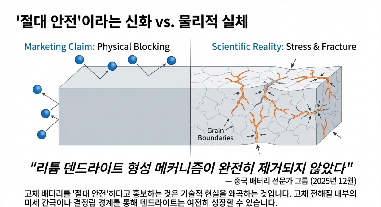 중국 전문가들이 2025년 12월 경고했듯이, "고체 배터리를 절대 안전하다고 홍보하는 것은 기술적 현실을 왜곡하는 것"이며, 덴드라이트 문제를 포함한 근본적 과제들이 여전히 존재합니다.