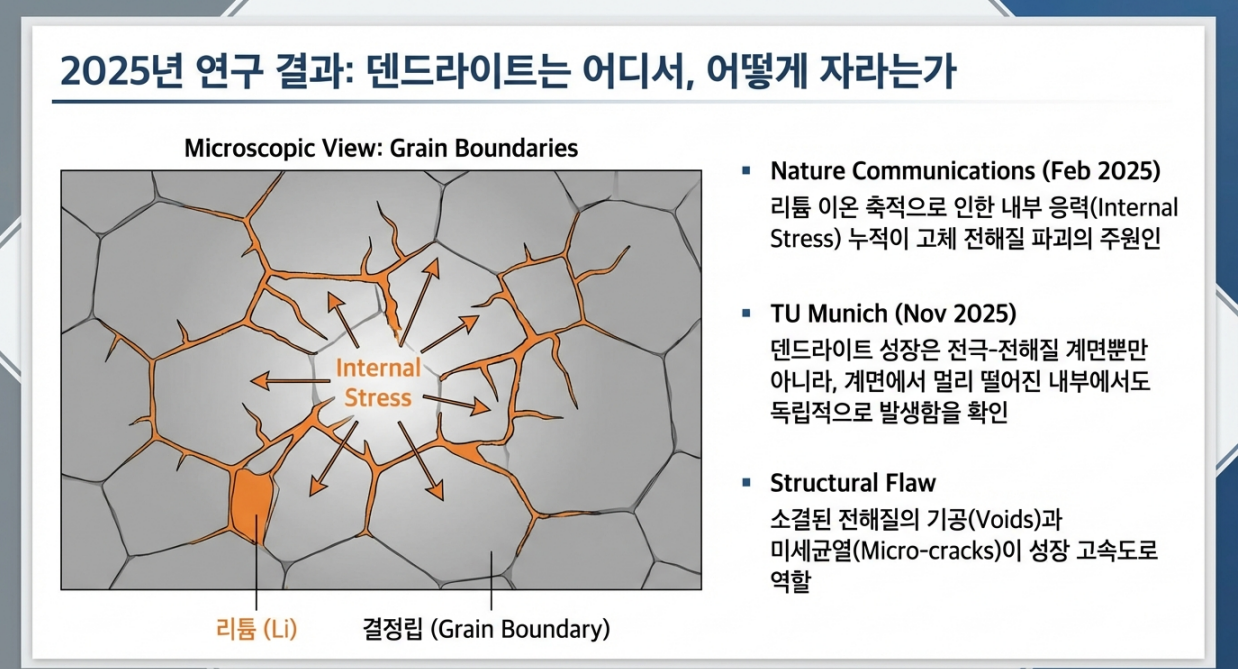 - 독일 뮌헨공대 연구 (2025년 11월): "지금까지는 덴드라이트 성장이 전극-전해질 계면에서만 발생한다고 가정했지만, 계면에서 멀리 떨어진 곳에서도 나타난다는 것이 확인되었습니다". 이는 고체 전해질에서도 단락의 위험이 존재한다는 것을 의미합니다.
