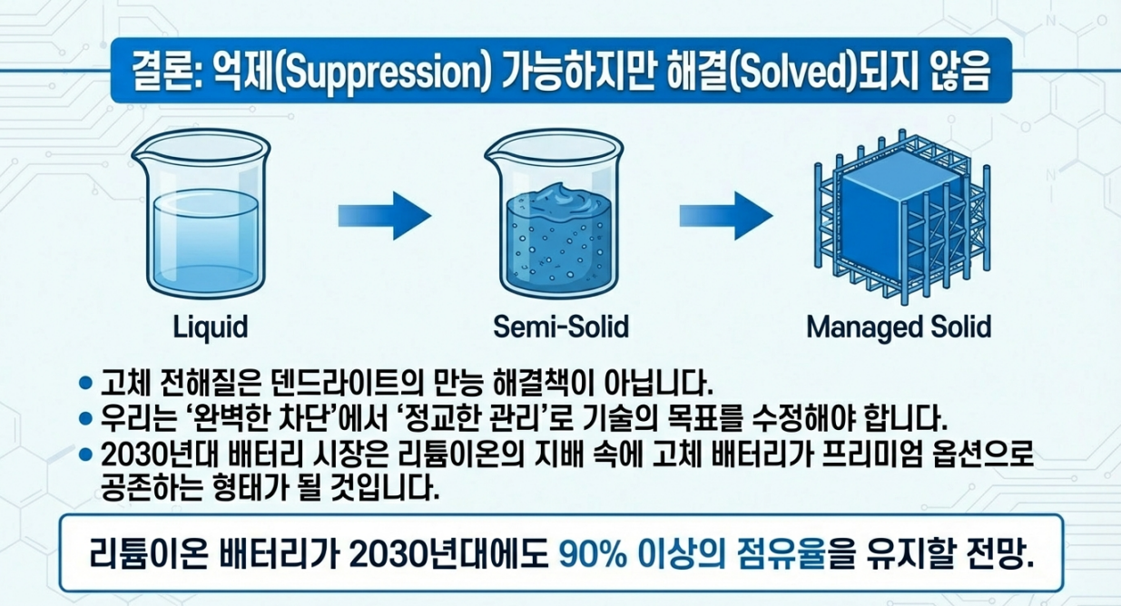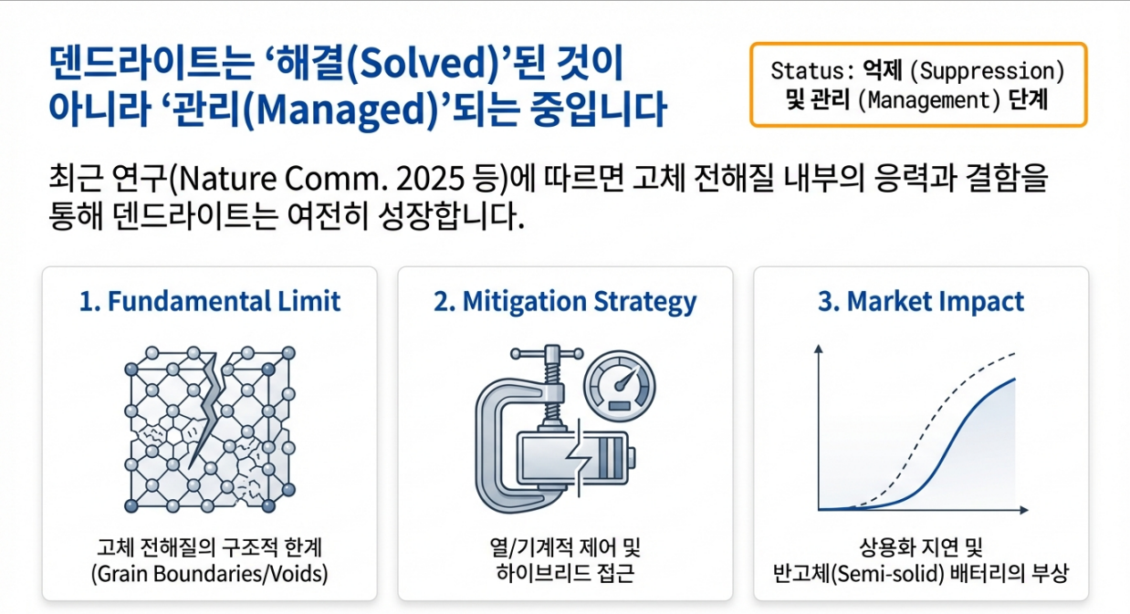 덴드라이트 문제는 "해결"되지 않았으며, 여전히 "억제(suppression)" 또는 "관리(management)" 단계에 머물러 있습니다. 고체 전해질을 사용하더라도 덴드라이트 형성을 완전히 차단할 수 없다는 것이 최근 연구들의 일관된 결론입니다.