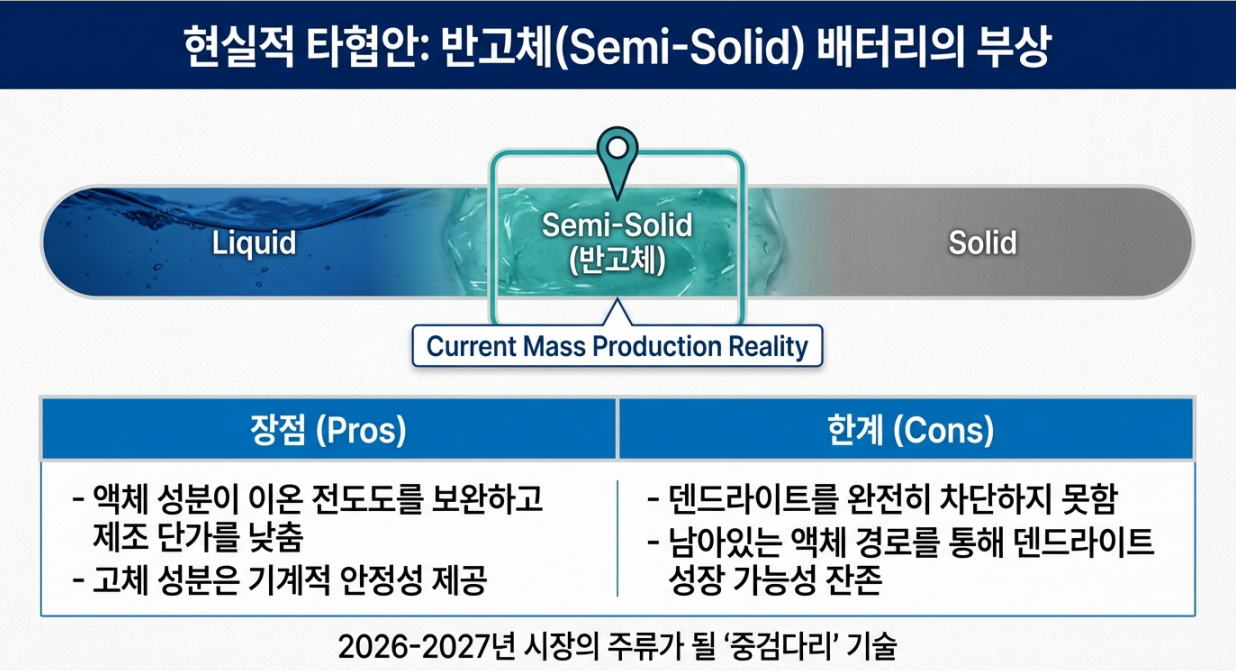 - 완전 고체 배터리보다 제조가 용이하고 비용이 낮음