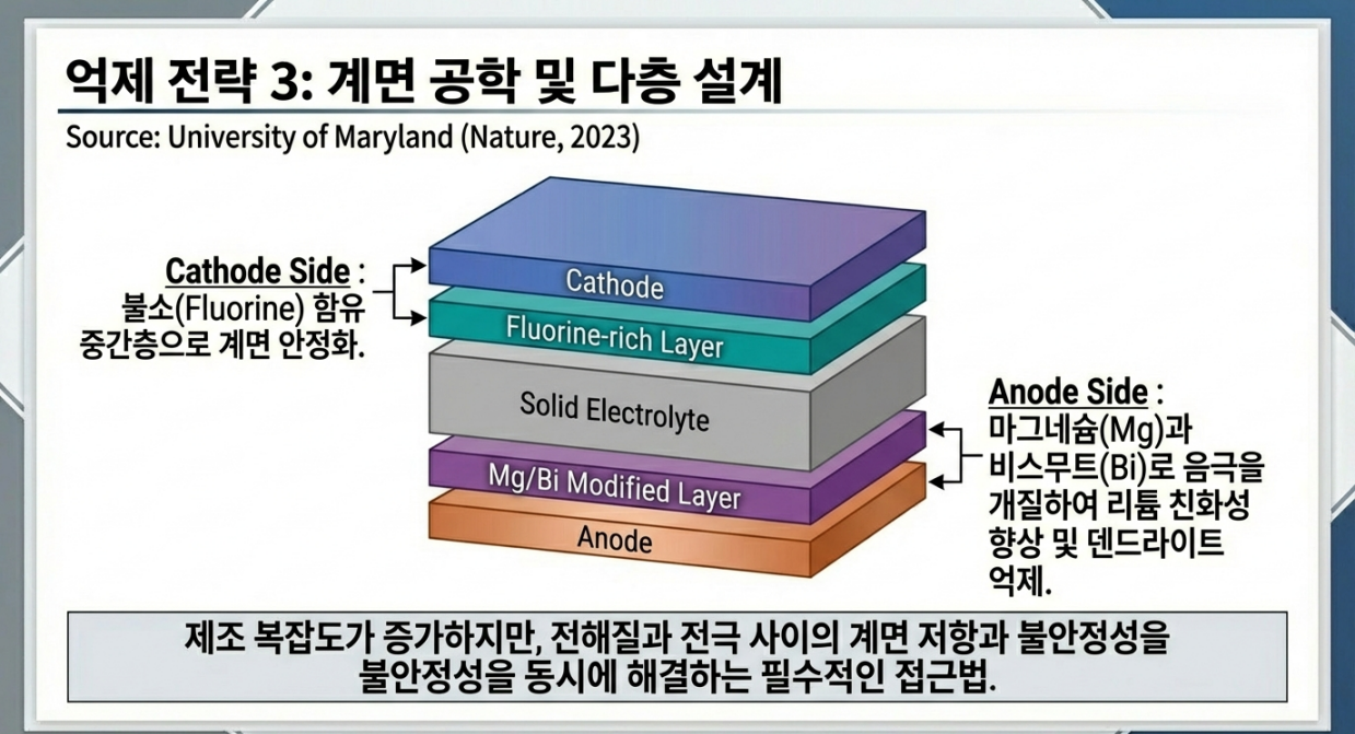 - 이 설계는 고체 전해질과 음극/양극 사이의 계면을 동시에 안정화시킵니다.