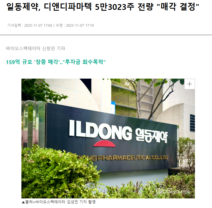 - 일동제약, 디앤디파마텍 지분 전량 매각 결정(장내매도) → ‘오버행’ 관점 체크 (2025.11.07) 바이오스펙테이터