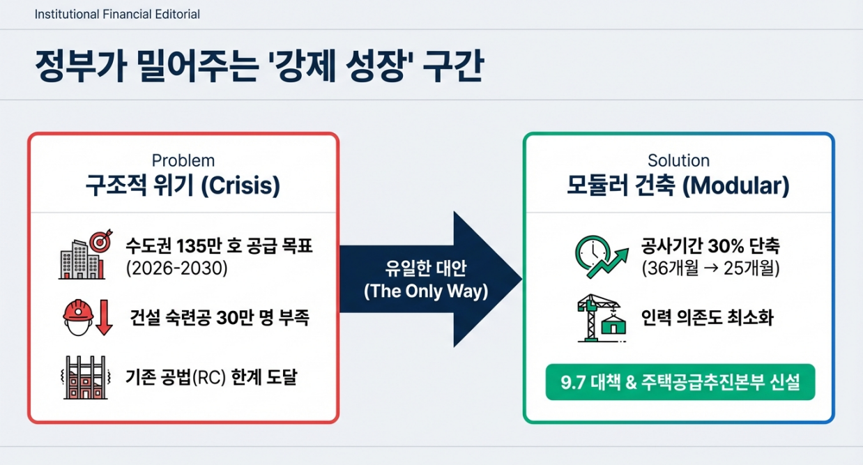 - 해법: 공기를 30% 단축(36개월 → 25개월)할 수 있는 모듈러 공법이 유일한 대안으로 지목되었습니다.