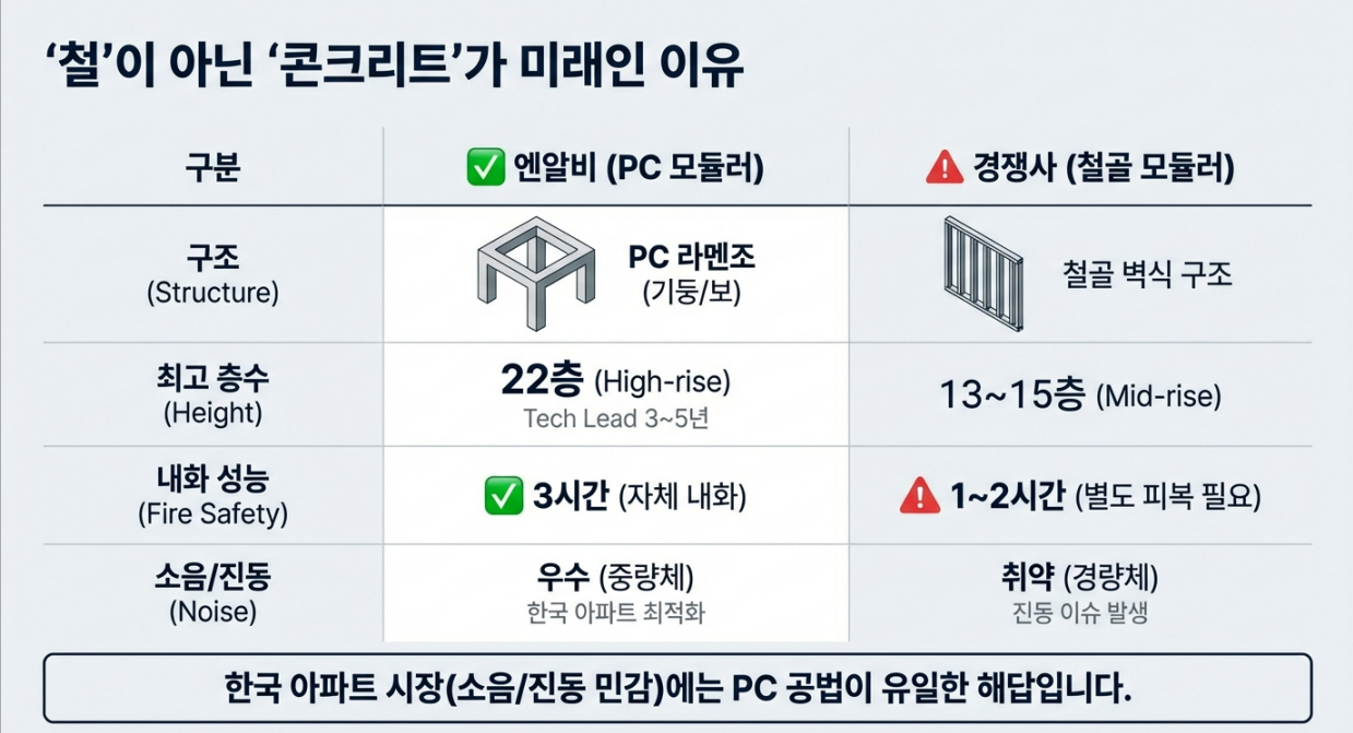 - 최고 층수: 엔알비 22층 vs 경쟁사 13~15층 (기술 격차 3~5년).