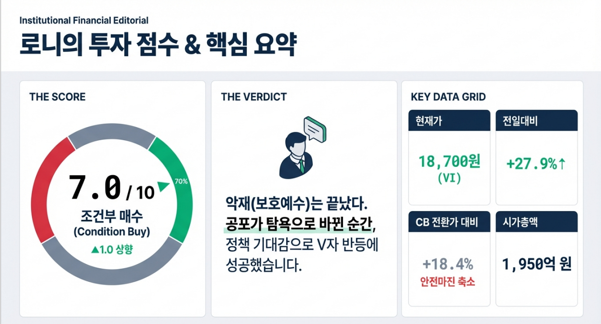 - 18,700원 (현재가): VI 발동으로 인한 단기 과열 구간. 추격 매수보다는 눌림목(17,000원대)을 기다리는 것이 현명합니다.