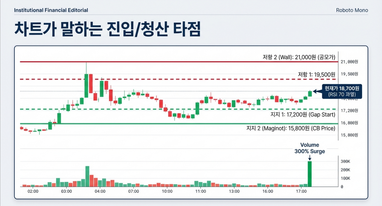- 21,000원 (공모가): 1차 목표가이자 저항선. 여기에 물린 악성 매물이 많아 강한 거래량이 터져야 돌파 가능합니다.