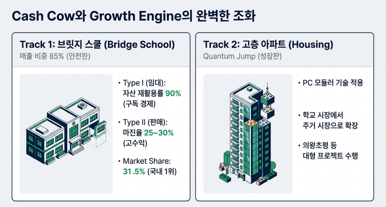 엔알비는 단순 컨테이너 제조사가 아닙니다. 국내 유일의 PC(Precast Concrete) 모듈러 고층화 기술을 보유한 테크 기업입니다. 사업 구조는 **'안정적 현금흐름(학교) + 폭발적 성장(아파트)'**의 투 트랙(Two-Track) 전략입니다.