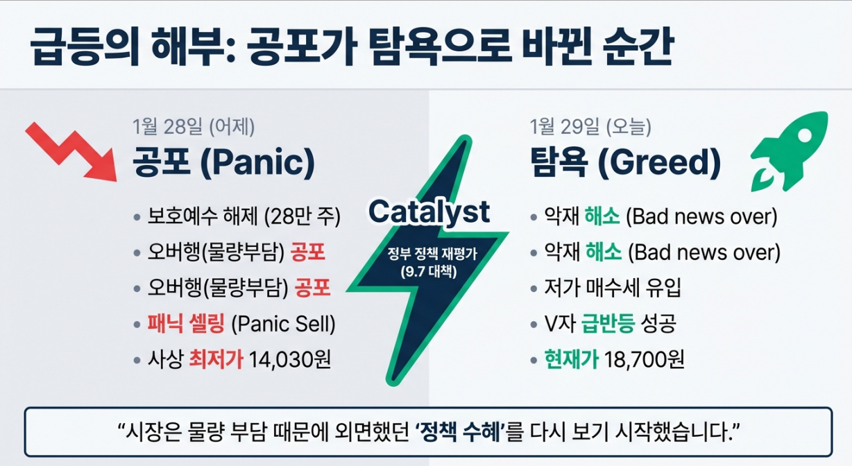 - 1/29 (오늘): "나올 물량 다 나왔다"는 안도감 + "너무 싸다"는 저가 매수세 유입 → V자 급반등.