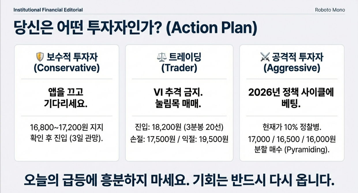 - 시나리오 B (눌림목 조정, 확률 60%): VI 해제 후 차익 매물 출회 → 17,000원대 중반으로 밀려서 마감 → 2~3일간 횡보하며 매물 소화. (가장 이상적)
