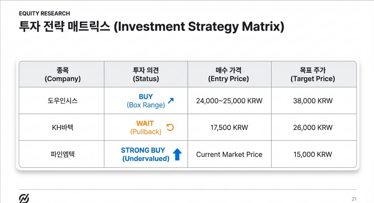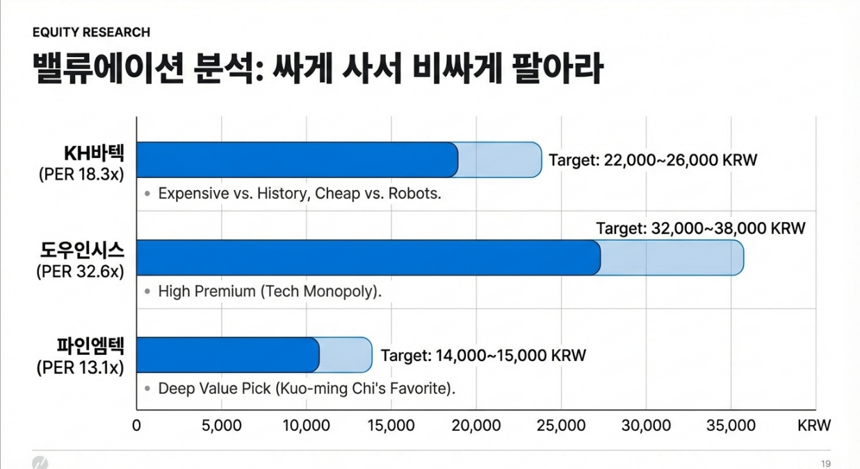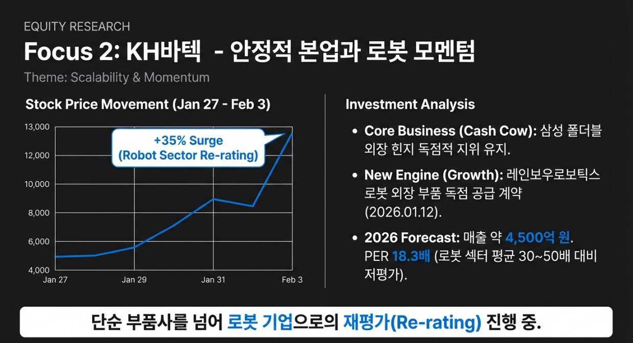 Comment: 리포트 발간일(1/27) 대비 KH바텍이 14,200원 → 19,120원으로 약 35% 급등했습니다. 단순 폴더블 부품사를 넘어 로봇 부품사로 재평가받고 있습니다.