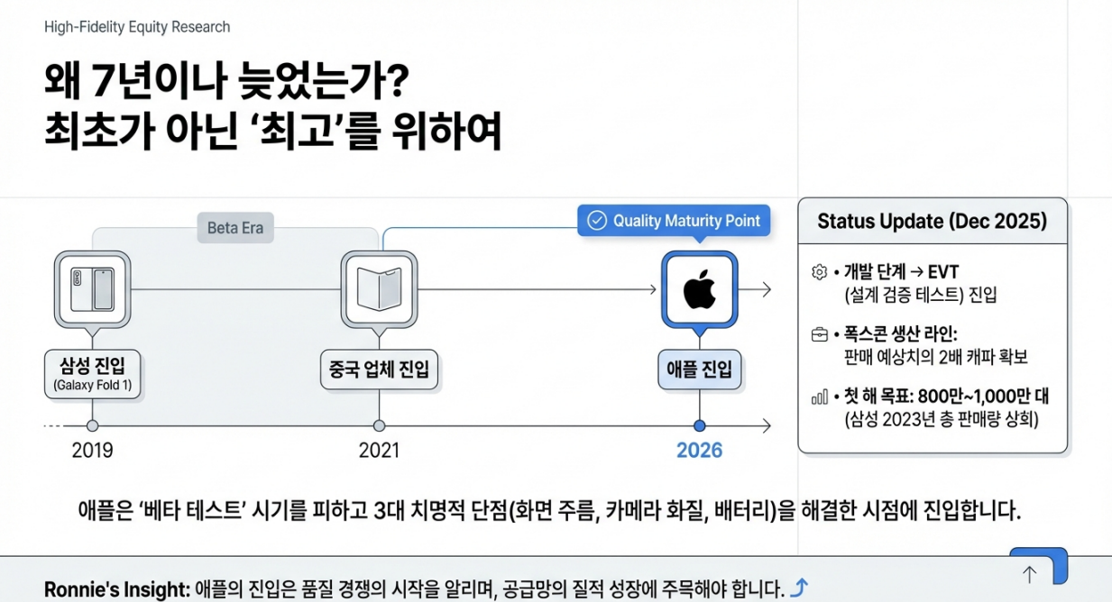 2019년 삼성전자의 첫 폴더블폰 출시로 시작된 폴더블 시장은 2025년 일시적 조정(-14.4%)을 거쳐, **2026년 애플의 진입과 함께 제2차 중흥기(+46%)**를 맞이합니다.