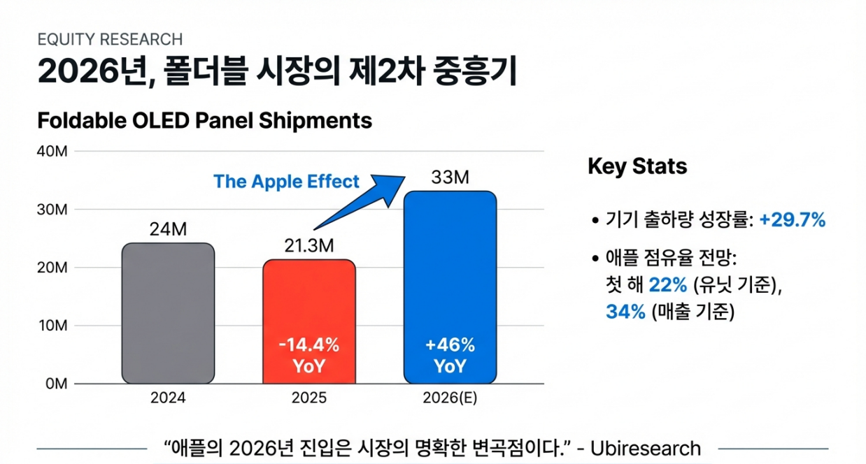 - 2026년 폴더블 시장은 29.7% 급성장이 전망되며, 이는 전적으로 애플의 진입 효과입니다.