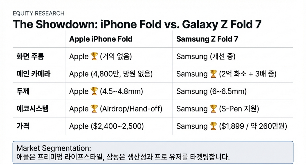 | 비교 항목 | 애플 아이폰 폴드 | 삼성 갤럭시 Z폴드7 | 승자 |