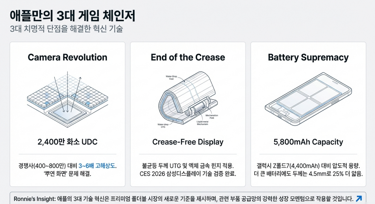 2026년 1월 라스베가스 CES 2026에서 삼성디스플레이가 공개한 **'무주름 폴더블 디스플레이'**는 업계 최대 난제였던 화면 주름 문제를 사실상 해결했습니다. 화면을 펼쳤을 때도 접힘 자국이 거의 보이지 않는 이 기술이 애플 폴더블에 탑재될 것으로 확실시됩니다.