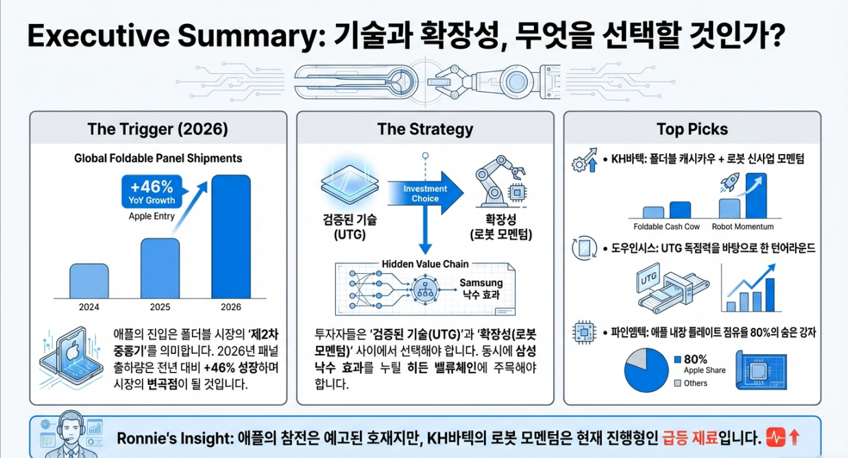 간접 수혜: 도우인시스, KH바텍 - 가격 장벽이 최대 과제입니다. 애플 폴더블(약 350만원) 고가 정책이 시장 확대 속도를 제한할 수 있습니다.