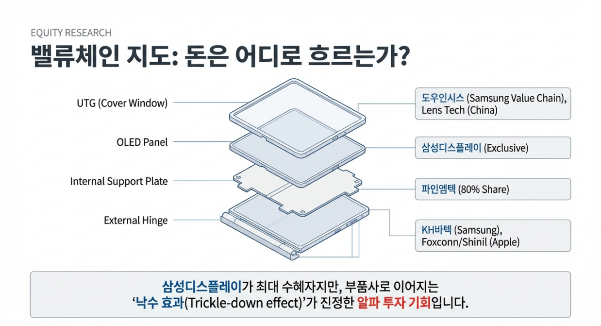 - 한국 부품사 직접 수혜: 삼성디스플레이, 파인엠텍