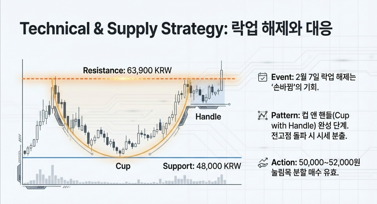 - 익절/손절: 63,000원 부근에서 절반 매도(이익 실현) 후 나머지는 5일선 이탈 시까지 홀딩. 손절은 48,000원 이탈 시.
