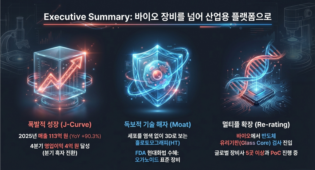 "살아있는 세포를 3D로 보는 독보적 기술(HT). 이제 바이오(오가노이드)를 넘어 반도체 유리기판·TGV 검사 장비로 멀티플 확장이 시작된 구간."