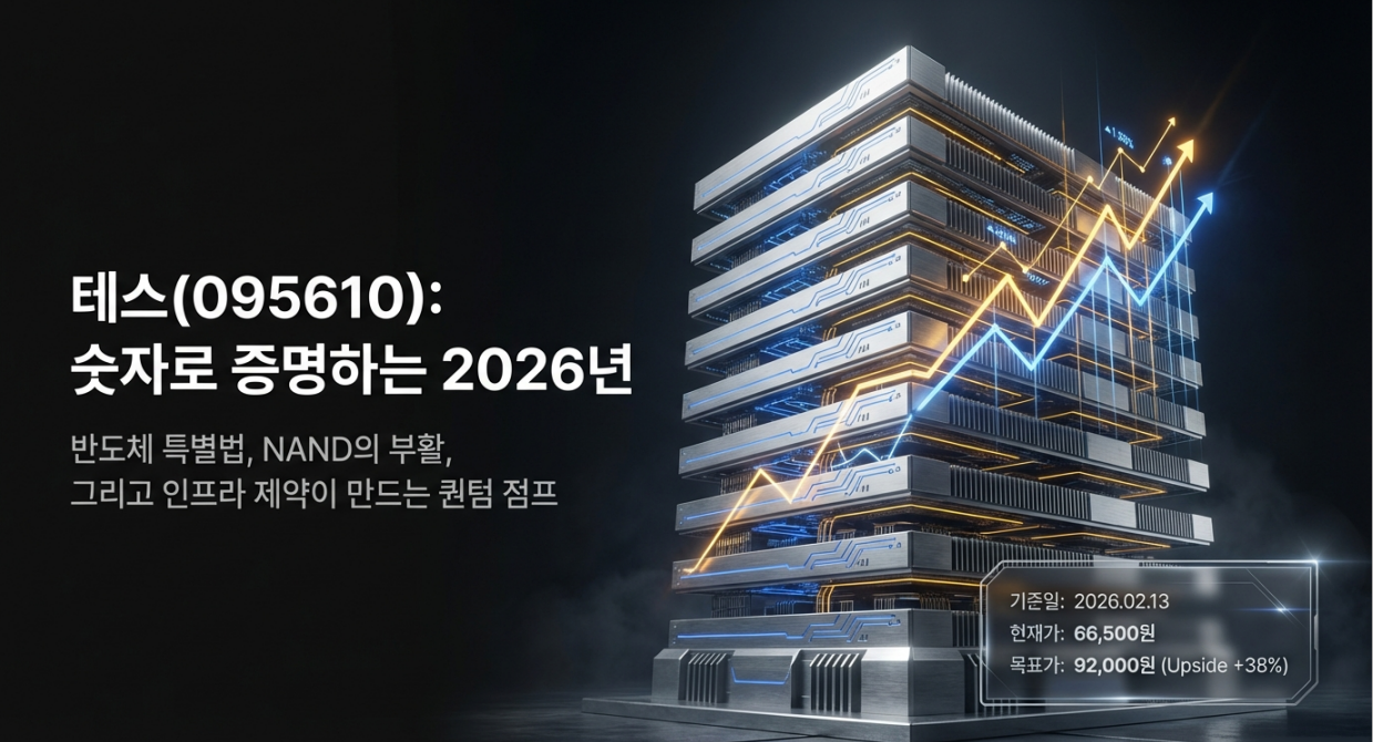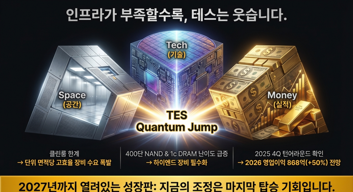 테스는 **"메모리 투자 확대 + 반도체 특별법 + NAND 고단화"**라는 세 가지 강력한 모멘텀 위에서, 이미 숫자로 확인된 턴어라운드(2025년)와 영업이익 800억 레벨업(2026년)을 동시에 바라보는 전공정 핵심 장비주입니다.
