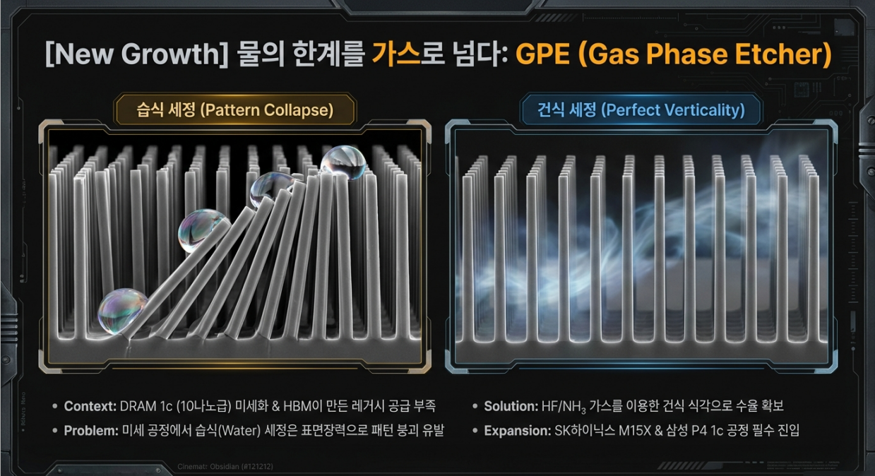 - 미세화될수록 HAR 구조와 패턴 안정성 이슈가 커지기 때문에, GPE 같은 건식 가스 세정 장비의 채택 폭이 넓어지는 구간입니다.