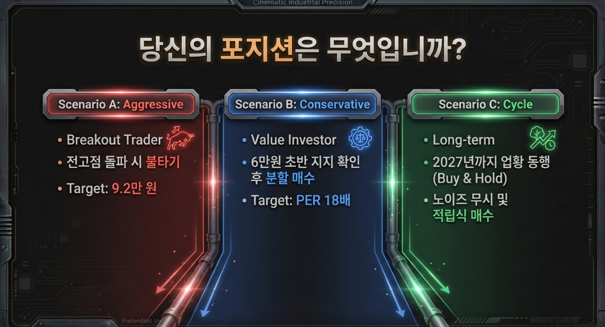 - 현재 구간(6만 중반대 전후)을 기준으로, “박스 상단 조정 + 실적·수급은 우상향”이라는 전제를 두고 30~50% 선제 진입.
