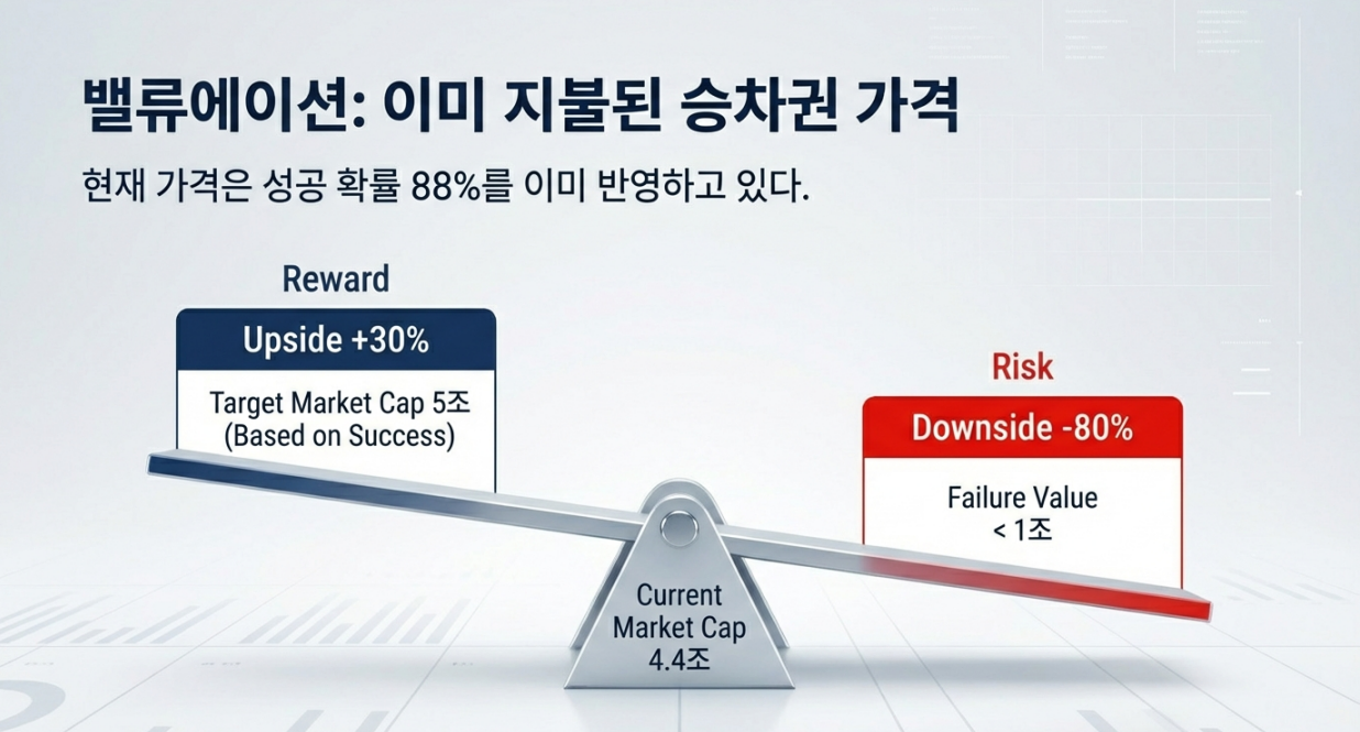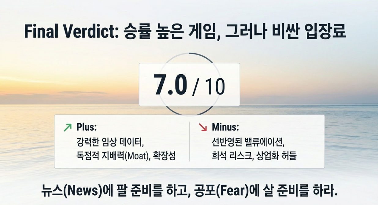 "임상 데이터는 '성공'을 가리키지만, 주가는 이미 '축포'를 터뜨렸다. 지금은 80%의 확률에 베팅하되, 남은 20%의 리스크를 헷지(Hedge)해야 할 때."