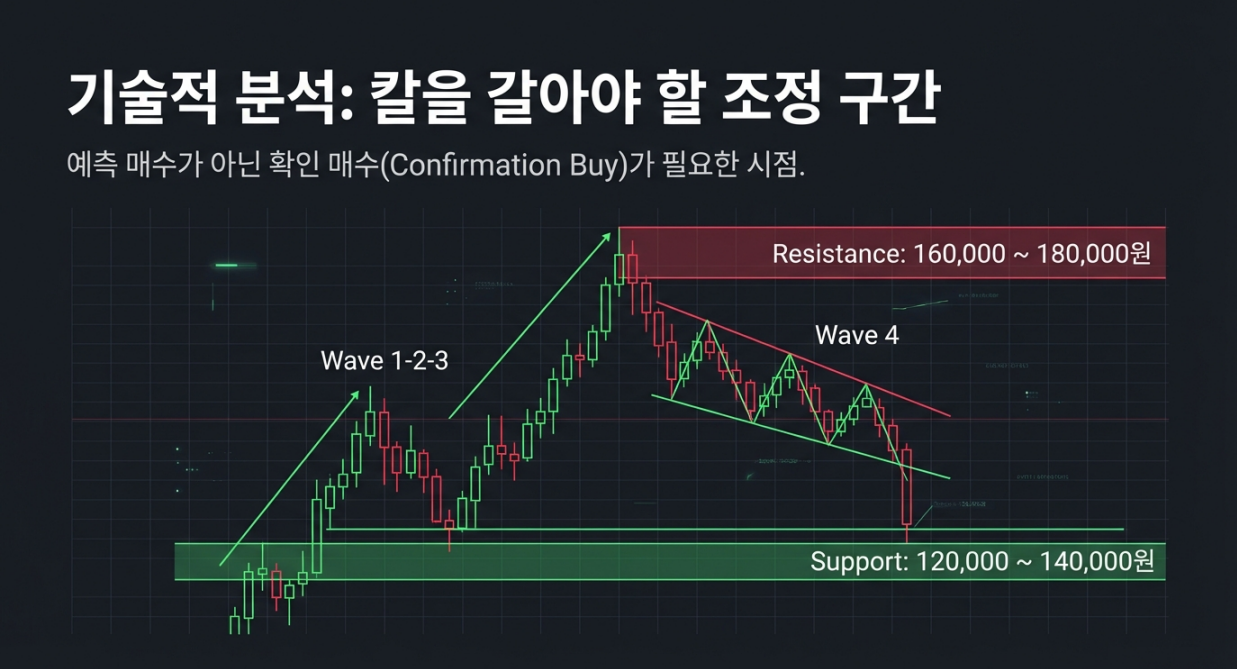 [기술적 승부처] 고점(17.9만) 대비 -19% 조정. 과열은 식었으나, 14만원 지지선에서의 공방이 치열함.