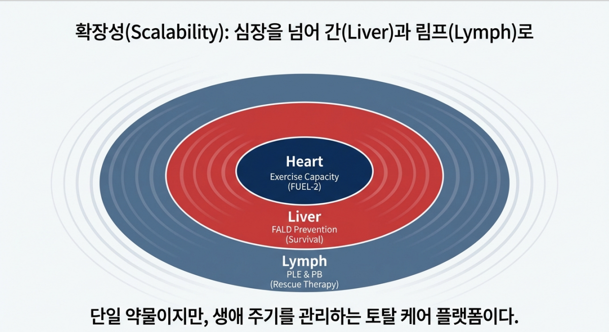 투자자들이 메지온을 볼 때 가장 많이 하는 오해는 “운동 좀 더 잘하게 해주는 약(Lifestyle Drug) 아닌가?”입니다. 하지만 유데나필의 본질은 **“펌프가 없는 심장(폰탄 순환)의 혈류 역학을 교정해 장기 생존율을 높이는 질병 수정 약물(Disease‑Modifying Drug)”**에 더 가깝습니다. 이 섹션에서는 유데나필이 왜 폰탄 환자에게 필수인지, 그리고 FUEL‑2 성공 이후 시장이 어떻게 ‘간(Liver)’과 ‘림프(Lymph)’로 확장되는지 그 큰 그림을 정리합니다.