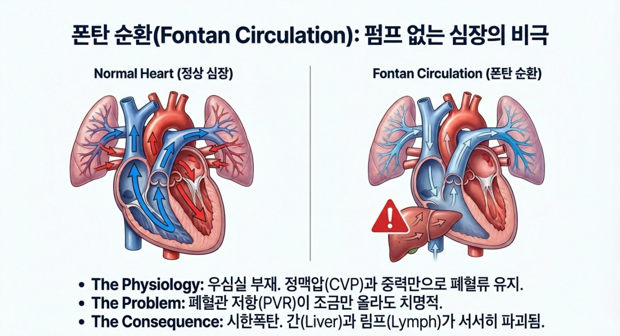 폰탄 수술을 받은 환자는 우심실(폐로 피를 보내는 펌프)이 없습니다. 온몸을 돌고 돌아온 정맥혈이 심장의 펌프질 없이, 오직 정맥압과 중력·호흡 운동만으로 폐까지 올라가야 합니다. 마치 1층 수도관에서 옥상까지 별도 펌프 없이 수압만으로 물을 올리는 구조와 같습니다.