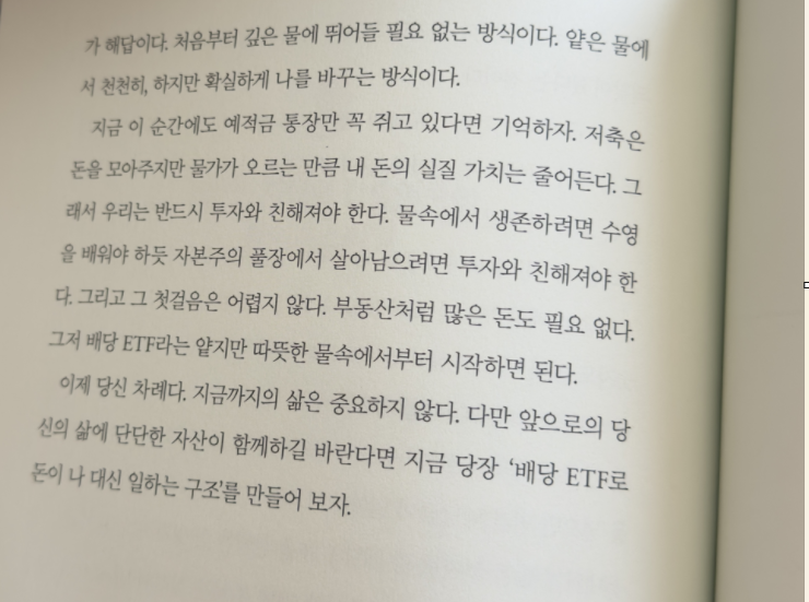 무엇보다 "초등학교 3학년 정도 수준의 산수만 할 줄 알면 된다"며 배당 투자의 쉬운 접근성을 강조하고, 복잡하고 위험한 깊은 심해의 투자가 아닌 **"얕지만 따뜻한 물속"**에 비유한 대목이 참 좋았습니다.