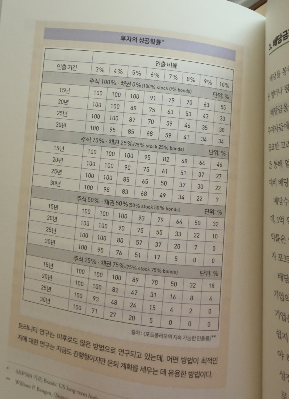 바로 투자자들 사이에서 전설처럼 내려오는 '트리니티 연구(The Trinity Study)'에 기반한 4% 법칙입니다. 은퇴 직전 모아둔 자산의 4%를 매년 생활비로 사용하면 30년 이상 파산하지 않는다는 이론인데, 책에서는 한 발 더 나아가 **주식과 채권의 비중(100:0부터 25:75까지) 및 인출 비율(3%~10%)에 따른 '투자의 성공확률 표'**를 아주 디테일하게 제공합니다.