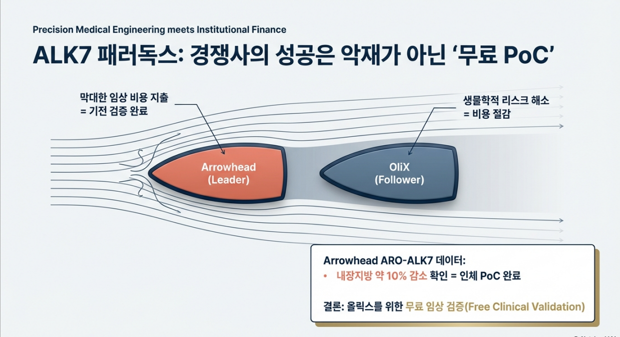 즉, ARO‑ALK7의 성공은 올릭스 ALK7 축(OLX702A·후속 프로그램)의 성공 확률(PoS)을 끌어올리는 무료 임상 역할을 한다.
