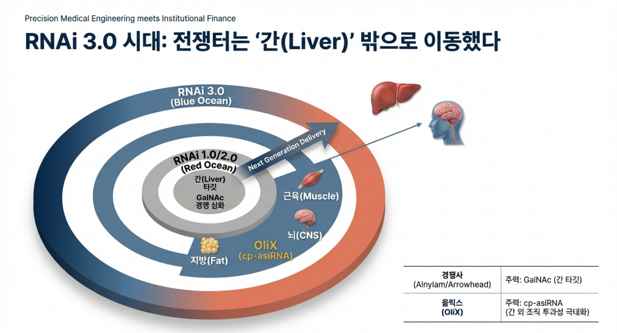 2026년 1월 JPM 2026에서 공개된 ‘올릭스 2.0’ 로드맵은 간(Liver) 타깃을 넘어 **중추신경계(CNS)**와 **지방조직(비만)**이라는 RNAi 3.0 시대의 핵심 영역을 정조준하고 있다.