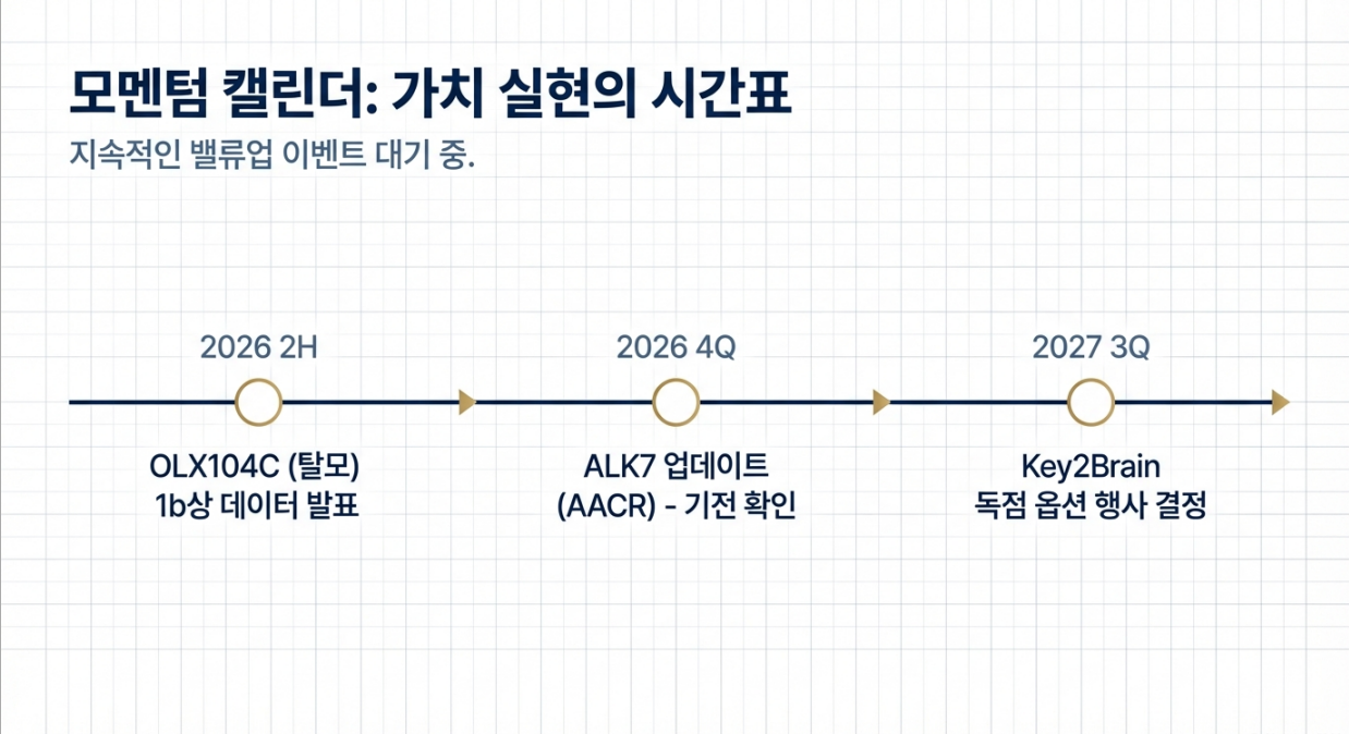 | 2026년 2H | OLX104C(탈모) 1b 초기 효능·안전성 데이터 | 여성 포함 탈모 시장 개척 가능성, 로레알 딜 확장 기대 |
