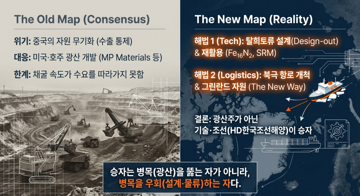 현재 시장은 희토류 광산·정광 생산자에게 높은 멀티플을 부여하면서도, 재활용·순환 체인의 가치는 과소평가한다. 폐자석·폐모터 내 희토류 농도는 광석 대비 1만배 이상이며, EU CRMA의 25% 재활용 의무화는 아시아·태평양에서만 연간 21억달러 규모의 탈희토류 모터·재활용 자석 시장을 형성할 수 있다. - Geopolitics: 그린란드와 북극항로