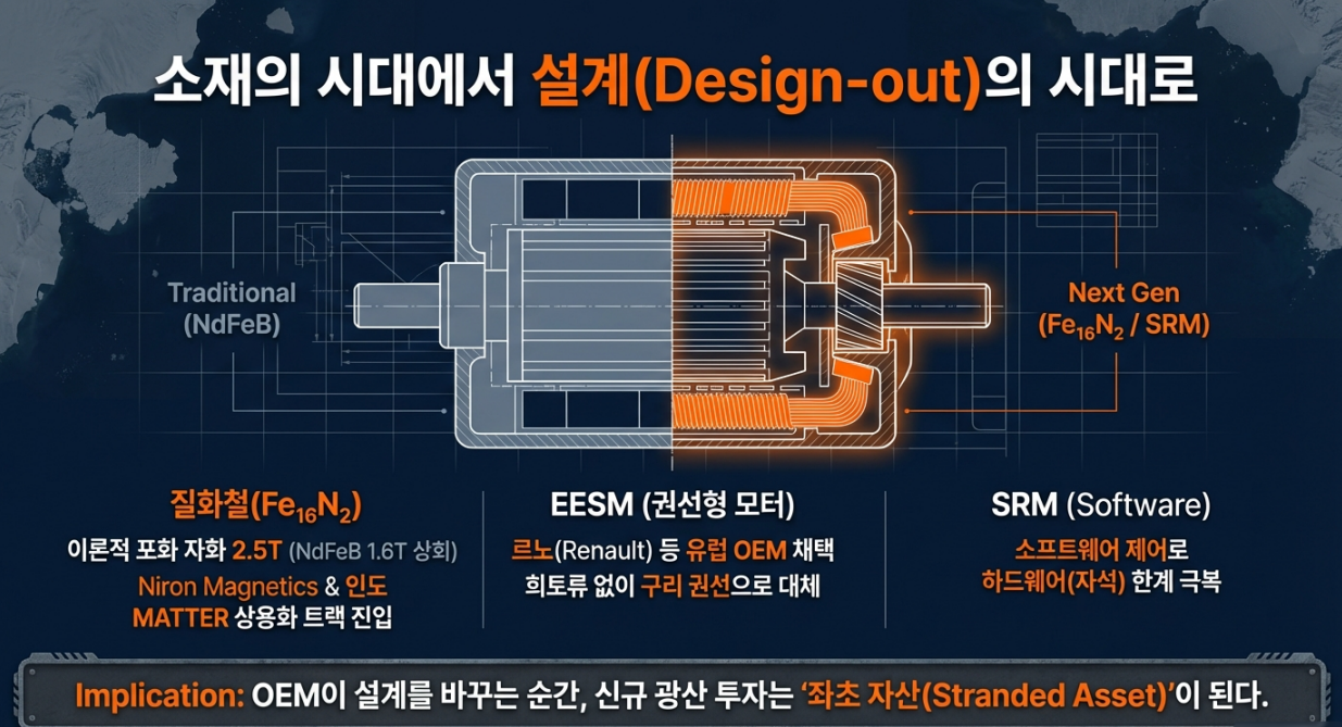 이 흐름이 본격화되면, 희토류는 군사·항공·정밀기기 등 일부 용도에 국한되고, 일반 EV·산업·가전용 모터에서는 Design-out이 표준화될 수 있다.