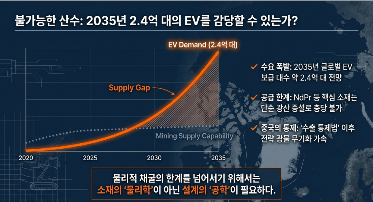 - 2035년 글로벌 EV 보급 대수는 약 2.4억대로 전망되며, NdPr·Dy·Tb 수급을 단순 광산 증설만으로 맞추는 것은 사실상 불가능하다.