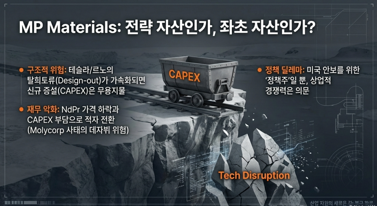 → MP Materials는 “미국 전략 비축·안보 포지션” 관점에서는 의미가 있지만, 순수 상업적 관점에서는 좌초 자산 리스크가 큰 고위험 자산이다.