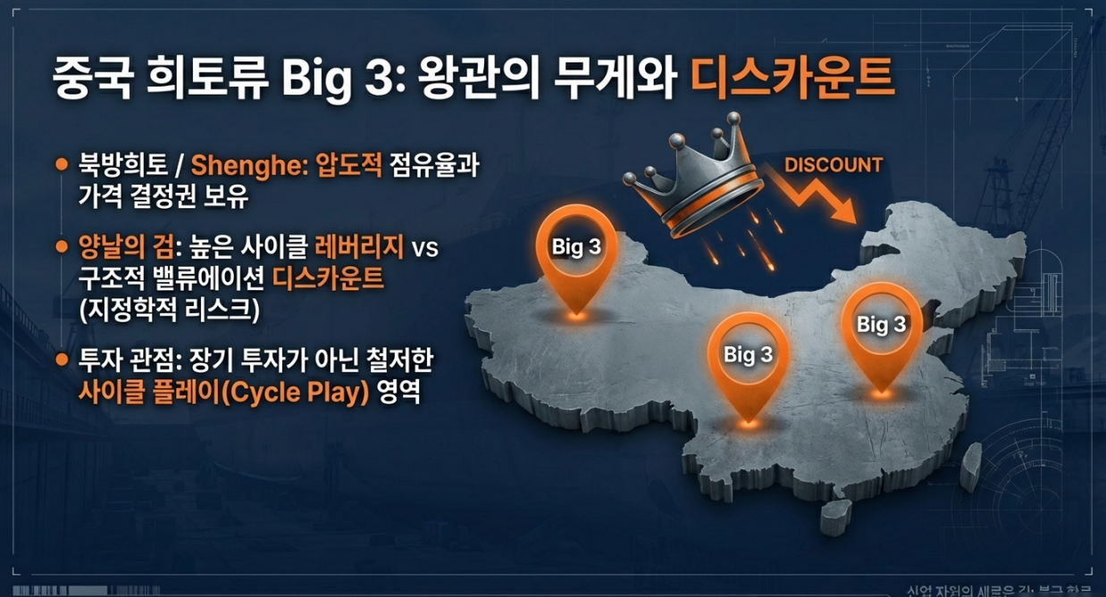 → 중국 REE Big 3는 “높은 사이클 레버리지 vs 구조적 디스카운트(정책·지배구조)”를 동시에 감수해야 하는 자산이다.